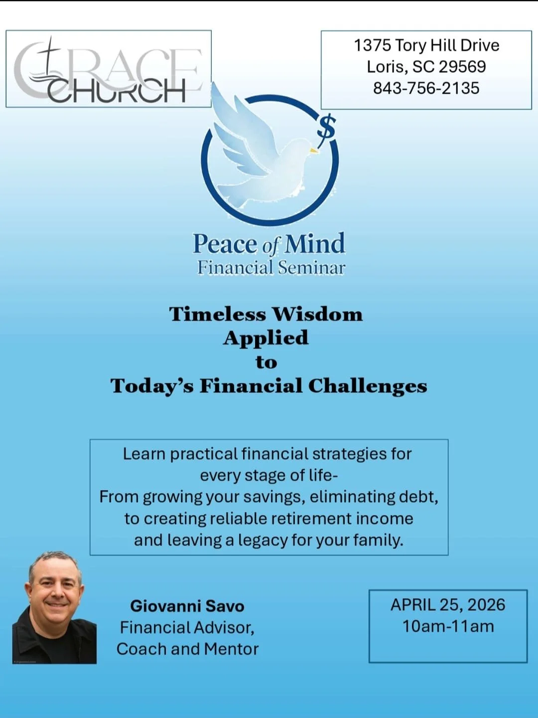 Join us at Grace Church for an insightful and practical financial seminar designed to help you navigate every stage of life with confidence and clarity. Whether you’re looking to grow your savings, eliminate debt, or build a secure future, this session will equip you with strategies you can apply right away.